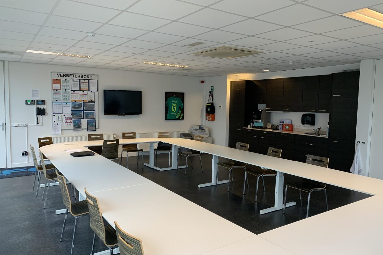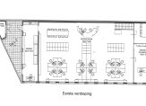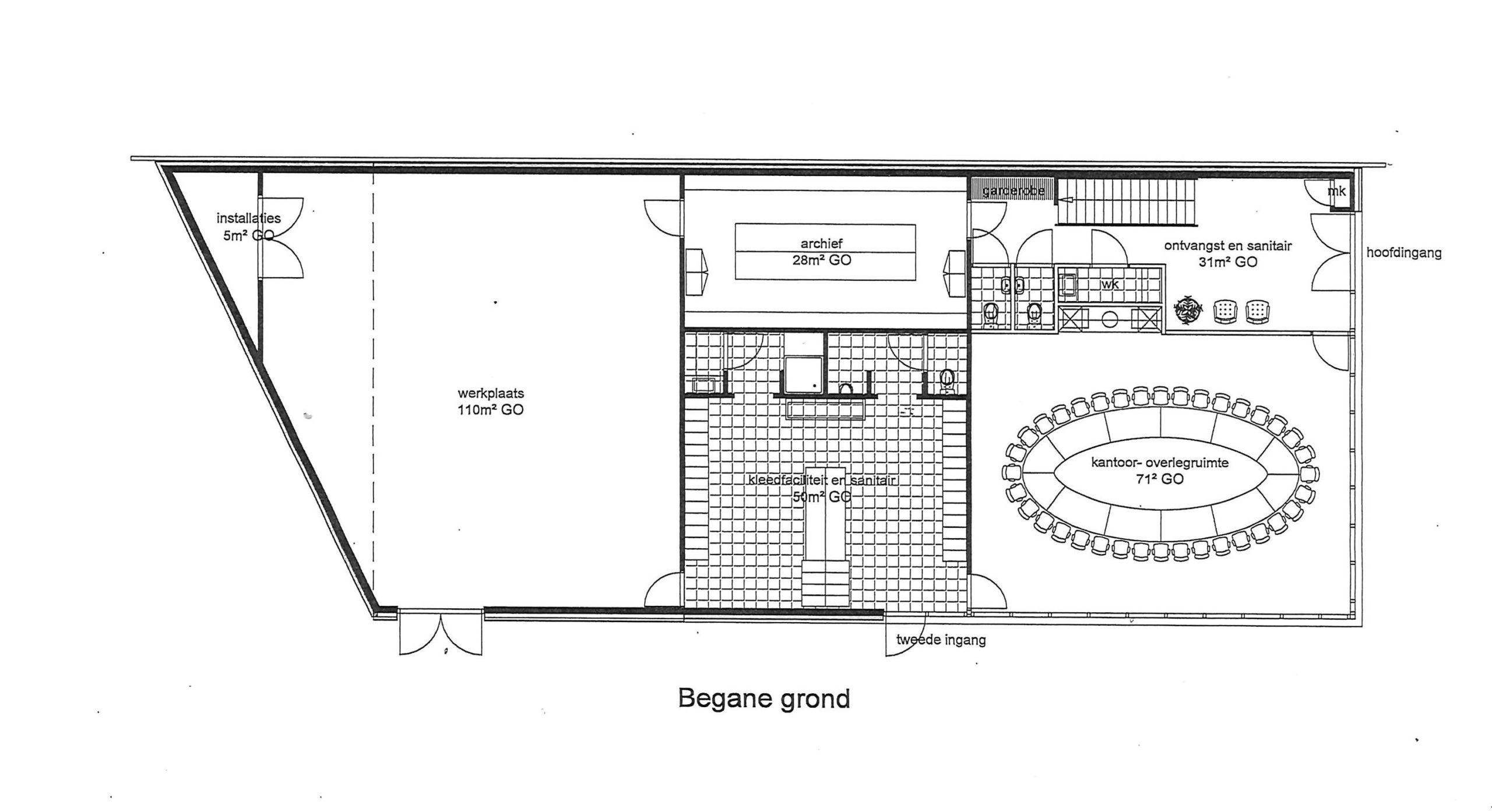 Indeling; BG. algemene entree, met naastgelegen kantoor/kantine (71m2) met grote pantry-voorziening, tussenhal met zij-entree met kleedruimte, toilet en douche, toegang naar de bedrijfsruimte/werkplaats (110m2) en de archiefruimte van 28m2.