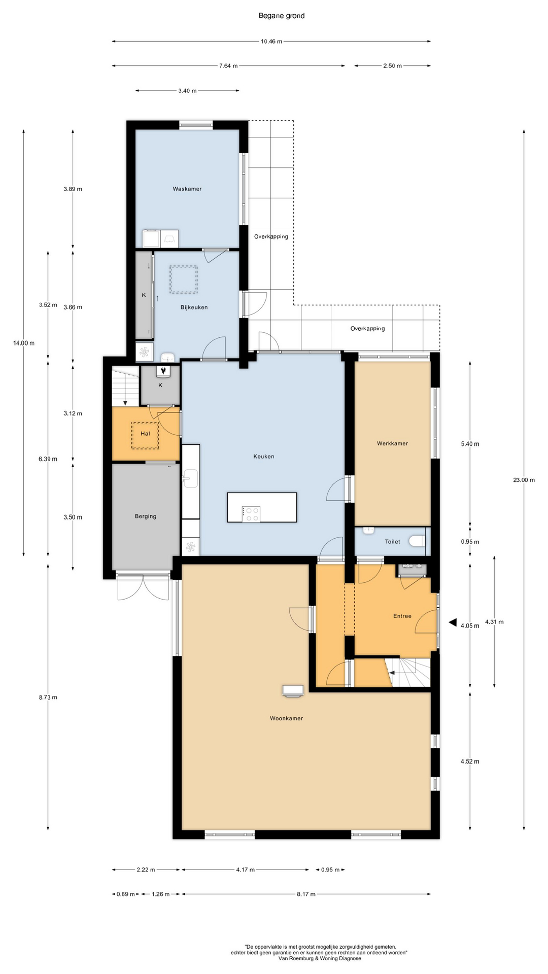 Begane grond: Entree aan de zijkant van het huis, ruime hal, toiletruimte met vrijdragend toilet en een fontein, royale en tevens sfeervolle L-vormige woonkamer met een notenhouten vloer en een draaibare houtkachel, grote woonkeuken met diverse inbouwapparatuur en met toegang tot het zonneterras van ca. 63 m2, speel-/werkkamer van ca. 14 m2, bijkeuken ook met toegang tot het terras en met vaste wastafel ca. 12 m2, extra kamer van ca. 13 m2 met ruimte en aansluiting voor wasmachine en wasdroger of te gebruiken als slaap-/hobbykamer, fietsenberging te bereiken via 2e entree aan de voorzijde van de woning, CV ruimte met extra bergruimte.