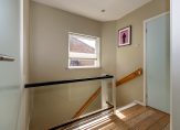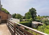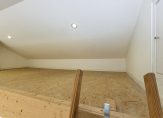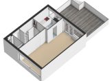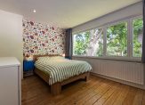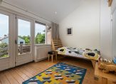 Overloop, twee slaapkamers, waarvan één met toegang tot het balkon aan de achterzijde. De kamer aan de achterzijde heeft een vide en vliering met toegang tot een bergzolder. De badkamer op deze verdieping beschikt over een douche, vaste wastafel en een toilet. Daarnaast is de voormalige douche ingericht als bergruimte.