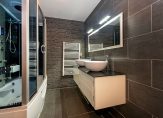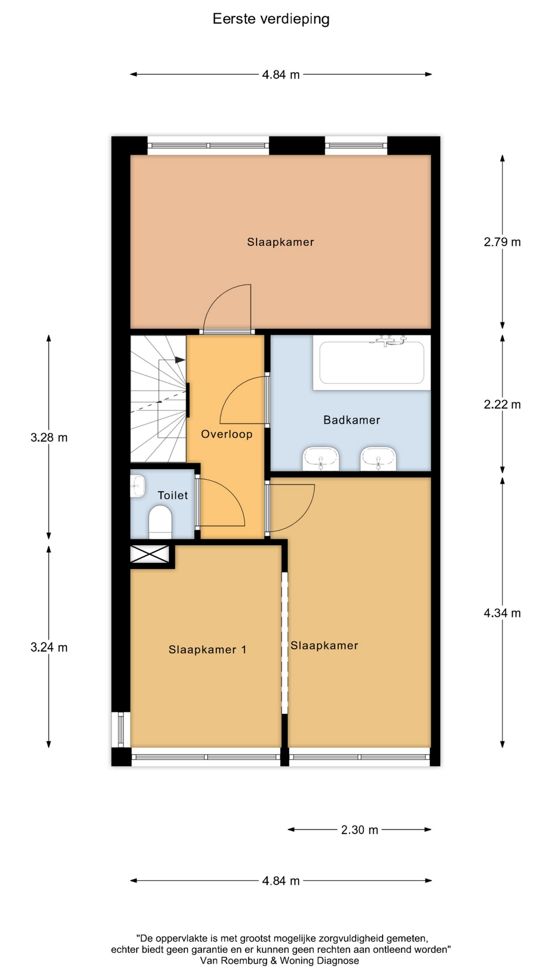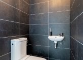 Eerste verdieping: Overloop, toilet, 3 slaapkamers (waarbij de 2 slaapkamers aan de voorzijde momenteel als 1 slaapkamer in gebruik zijn doch dat is weer eenvoudig in 2 slaapkamers te wijzigen), moderne badkamer met dubbele wastafel en een stoomdouche/ligbad.