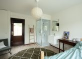 Wat deze woning extra interessant maakt is de aanwezigheid van een slaapkamer met douche op de begane grond. Het is dus een levensloop bestendige woning. Deze slaapkamer (15,75 m²) op de begane grond is ook uitermate geschikt als kantoor-praktijkruimte omdat deze te bereiken is via de ruime bijkeuken zonder dat men door het gehele huis gaat.