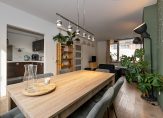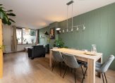 Aan de voorzijde komen we binnen in de hal, waar zich het toilet, de meterkast en een ruime bergkast bevinden. Uiteraard is hier ook de toegang naar de ruime woonkamer. Bij binnenkomst valt direct het vele licht op dat binnenkomt door de grote raampartijen aan zowel de voor- als achterzijde. De voorzijde leent zich goed voor een fijne zithoek. Aan de achterzijde is plek voor een ruime eettafel die daarmee in verbinding staat met de open keuken. De wanden zijn licht afgewerkt en er ligt een lichte laminaatvloer. De nette open keuken beschikt over vaatwasser, koelkast, combioven, gaskookplaat met afzuigkap. In de berging in de hal staat een 10 liter boiler voor snel warm water in de keuken.