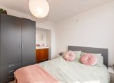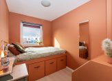 Via de dichte trap in de hal komen we uit op de overloop die toegang biedt tot de badkamer, 3 slaapkamers en een wasruimte. De nette badkamer beschikt over een inloopdouche, wastafelmeubel, wandcloset en vloerverwarming. De wanden van de slaapkamers zijn licht afgewerkt en op de vloer ligt een eveneens een lichte laminaatvloer. Twee slaapkamers beschikken over een eigen wastafelmeubel. In de voormalige badkamer is een wasruimte gemaakt.