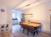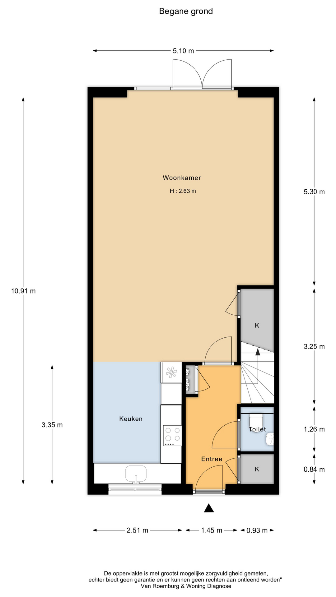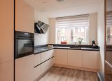 Entree met hal, inbouwkast, meterkast, toilet met fonteintje. De lichte woonkamer is uitgebouwd bij de bouw en beschikt over een PVC vloer met vloerverwarming, een trapkast met boileropstelling en openslaande deur naar de tuin en het terras. De moderne open keuken heeft een L-vorm. De keuken is voorzien van inbouwapparatuur zoals een koel-vriescombinatie, oven, afwasmachine, inductiekookplaat en afzuigkap.