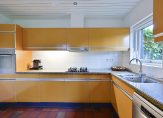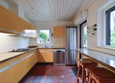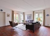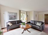 Entree/hal met garderobe, toilet, meterkast en toegang tot de aangebouwde berging. De royale woonkamer (ca. 45 m²) beschikt over dubbele openslaande deuren naar de achtertuin en dubbele openslaande deuren naar de zijtuin. De dichte keuken beschikt over het originele zeer verzorgde keukenblok voorzien van (moderne) inbouwapparatuur.