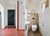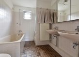 Overloop, eenvoudige badkamer met ligbad, inloopdouche, dubbele wastafel en toilet. Op deze verdieping bevinden zich 2 ruime slaapkamers (voorheen 3 en eenvoudig weer te herstellen).