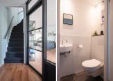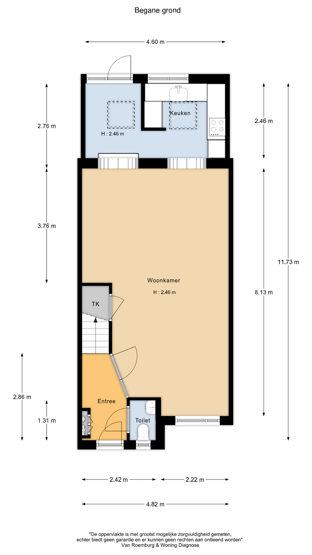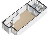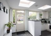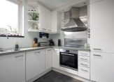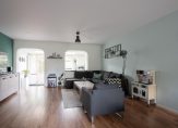 Begane grond: Entree/hal, meterkast, modern toilet met fontein, via de moderne zwarte glasdeur bereik je de lichte woonkamer met een laminaatvloer en een uitgebouwde halfopen keuken aan de achterzijde van het huis die voorzien is van 2 lichtkoepels en diverse inbouwapparaten zoals een inductie-kookplaat, afzuigkap, koel-/vriescombi en vaatwasser. Via de keuken is de achtertuin te bereiken.
