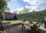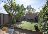De op het zuidwesten georiënteerde achtertuin heeft een terras, kunstgras, borders en een stenen berging. Vanuit de tuin is via een poort het pad aan de achterzijde bereikbaar.