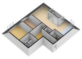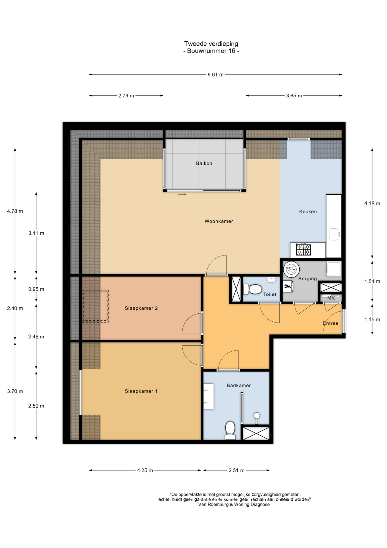 Entree/ruime hal, woonkamer met een oppervlakte van plm. 39 m2 met een open keuken en balkon, toilet, badkamer met dubbele wastafel, douche en toilet, technische ruimte, 2 slaapkamers.