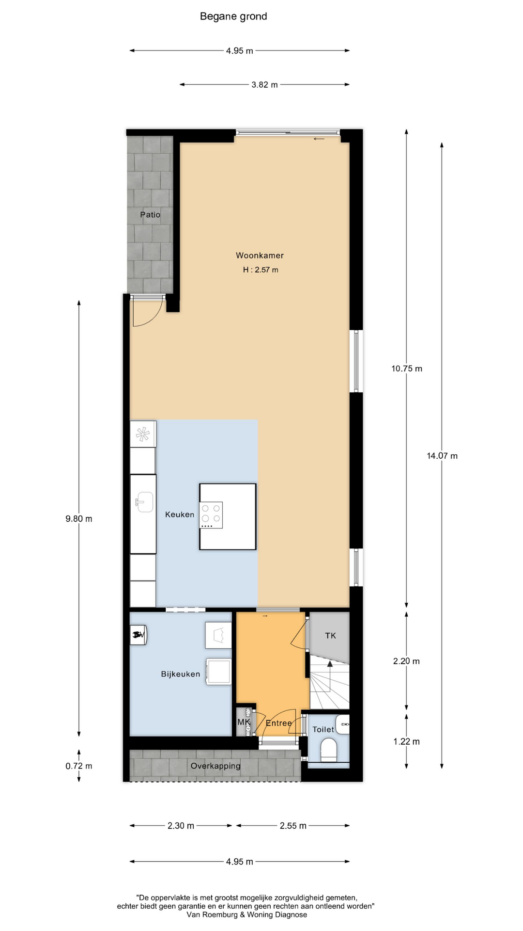 De begane grond van de woning bestaat uit een royale woonkamer met moderne open keuken (2024) met kookeiland en een oppervlakte van 53 m2. De woonkamer heeft een schuifpui welke toegang geeft tot de perfect op de zon gelegen serre en aangrenzende tuin.