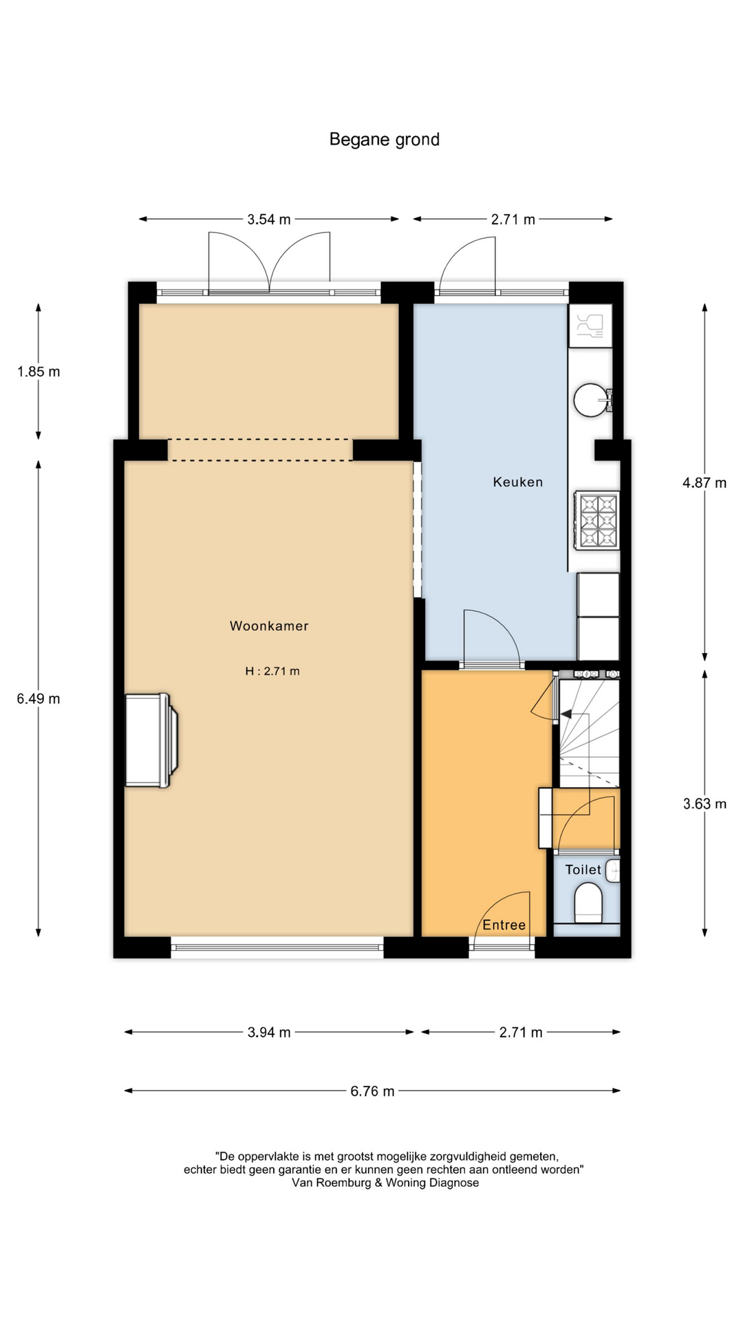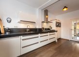 De entree is royaal en geeft toegang tot het toilet, de kelder en de keuken. De moderne keuken is voorzien van diverse inbouwapparatuur, waaronder een vijfpits gaskookplaat, afzuigkap, koffiezetapparaat, combi-oven en vaatwasser. Een deur biedt directe toegang tot de tuin en hier is ook een plek om ontspannen te ontbijten. De woonkamer is uitgebouwd en voorzien van een gashaard, een fraaie plankenvloer en openslaande deuren naar de tuin.