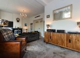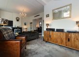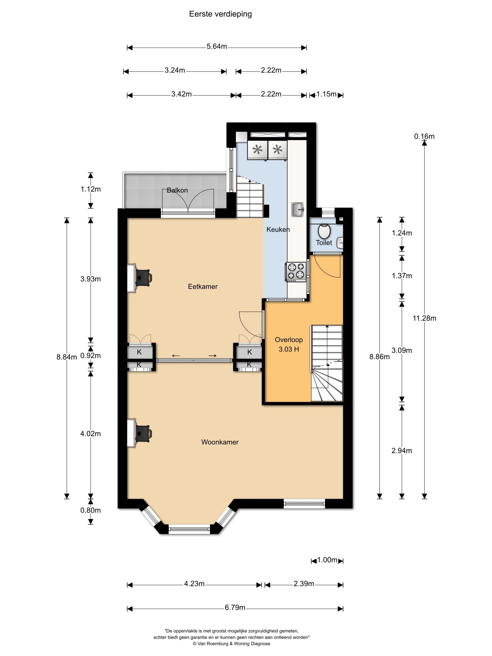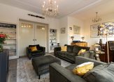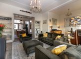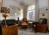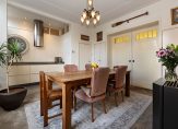 Eerste verdieping: Overloop, modern toilet, woonkamer-en-suite. Deze twee kamers-en-suite bestaan uit een zitkamer aan de voorzijde met diverse authentieke elementen zoals een schouw, glas-in-lood ramen, suite-deuren en een erker. Aan de achterzijde bevindt zich de eetkamer, eveneens met een schouw en met openslaande deuren naar het balkon. In de eetkamer is een vaste trap gerealiseerd naar het dakterras. De moderne open keuken is voorzien van alle gemakken.