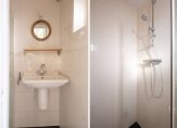 De woonkamer is gelegen aan de voorzijde en voelt door de grote ramen heerlijk licht en ruim aan. Bovendien is er door middel van schuifdeuren een verbinding met de eetkamer. De dichte keuken is voorzien van diverse apparatuur, is netjes en biedt voldoende ruimte om te koken. Aansluitend aan de keuken is een klein maar nette douche met wastafel gelegen.