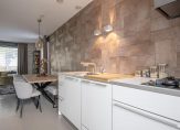Het leefgedeelte bestaat uit een woonkamer met een schuifpui naar het terras en een moderne keuken. Het koken zelf is een fijne ervaring dankzij de aanwezige moderne inbouwapparatuur waarbij je beschikt over een koel- en vriescombinatie, een combi oven en een vaatwasser.