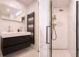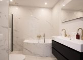 Een praktische inrichting vind je ook weer in de zeer luxe badkamer met ligbad, ruime inloopdouche, toilet en een wastafelmeubel.