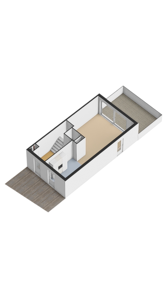 Via het hofje waar de woning zich aan bevindt kom je bij de voordeur van de woning waar je binnenkomt in de hal. Vanuit hier heb je toegang tot het toilet, de trap naar de bovenverdieping en tot het leefgedeelte.