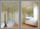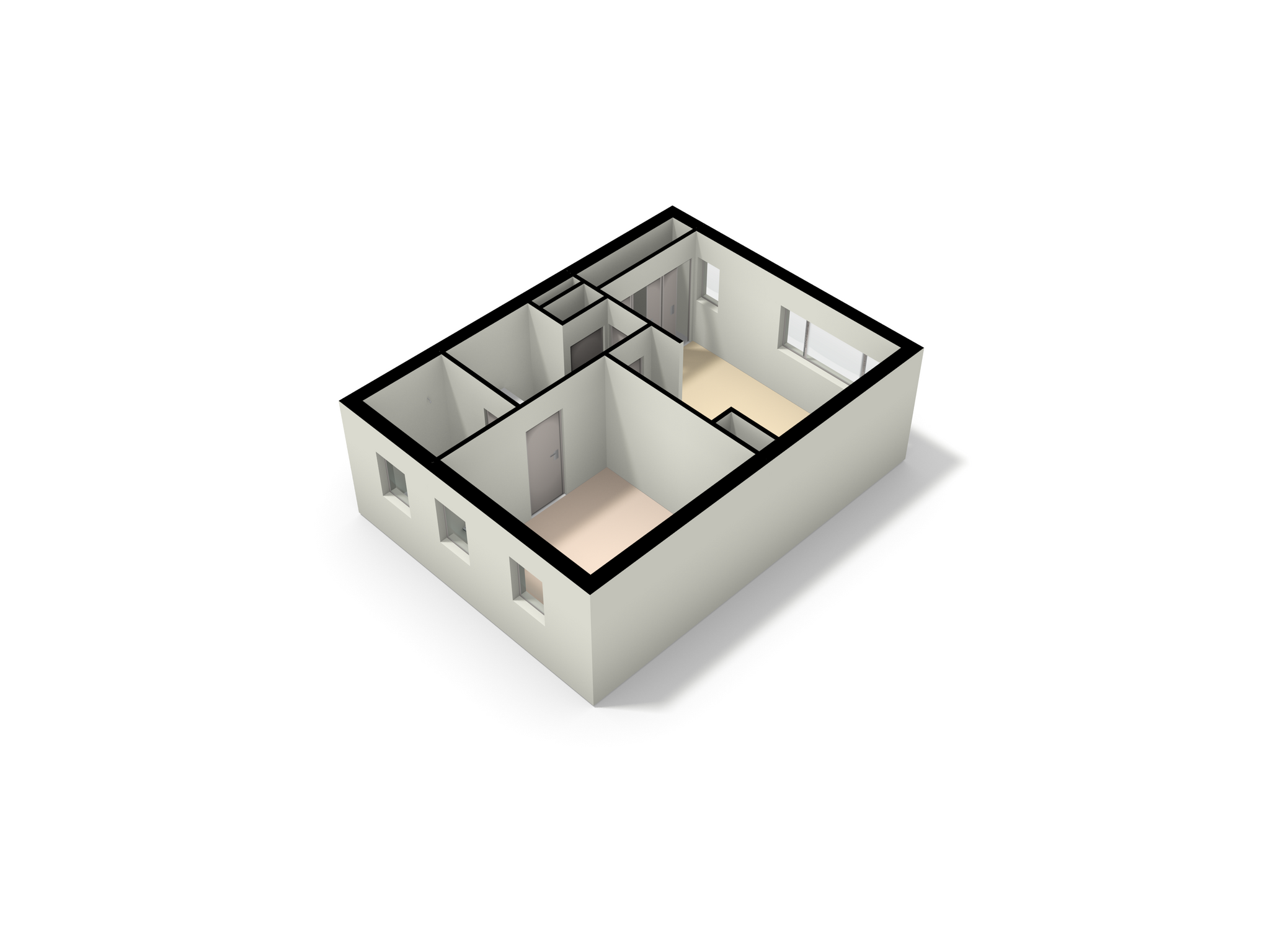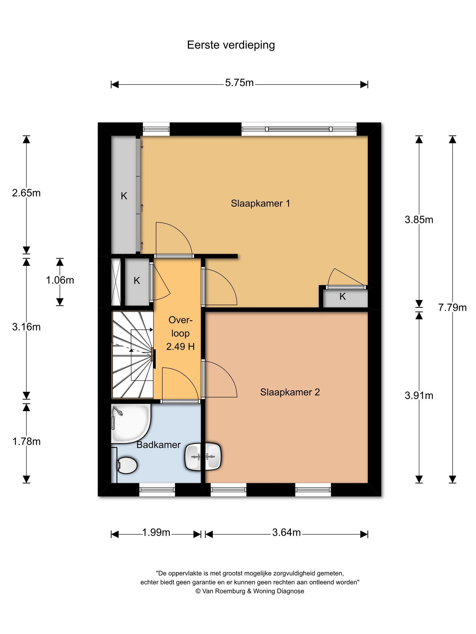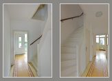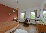 Eerste verdieping: overloop, twee slaapkamers en een derde (momenteel bij de ouderslaapkamer getrokken tot één royale kamer met kastenwand — maar eenvoudig weer terug te brengen naar drie kamers), badkamer met douche, wastafel en toilet.