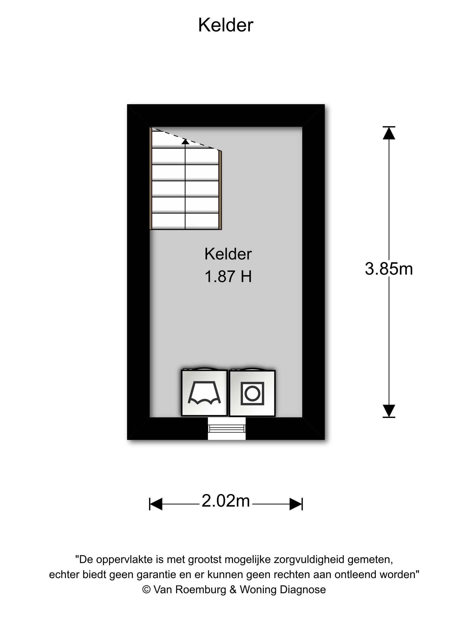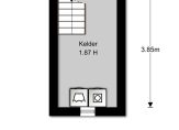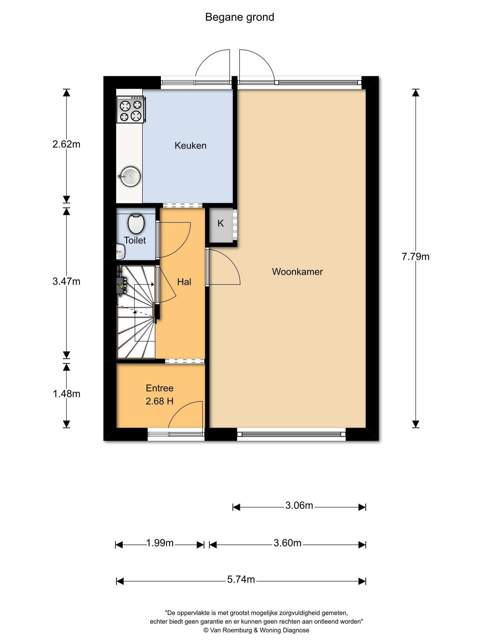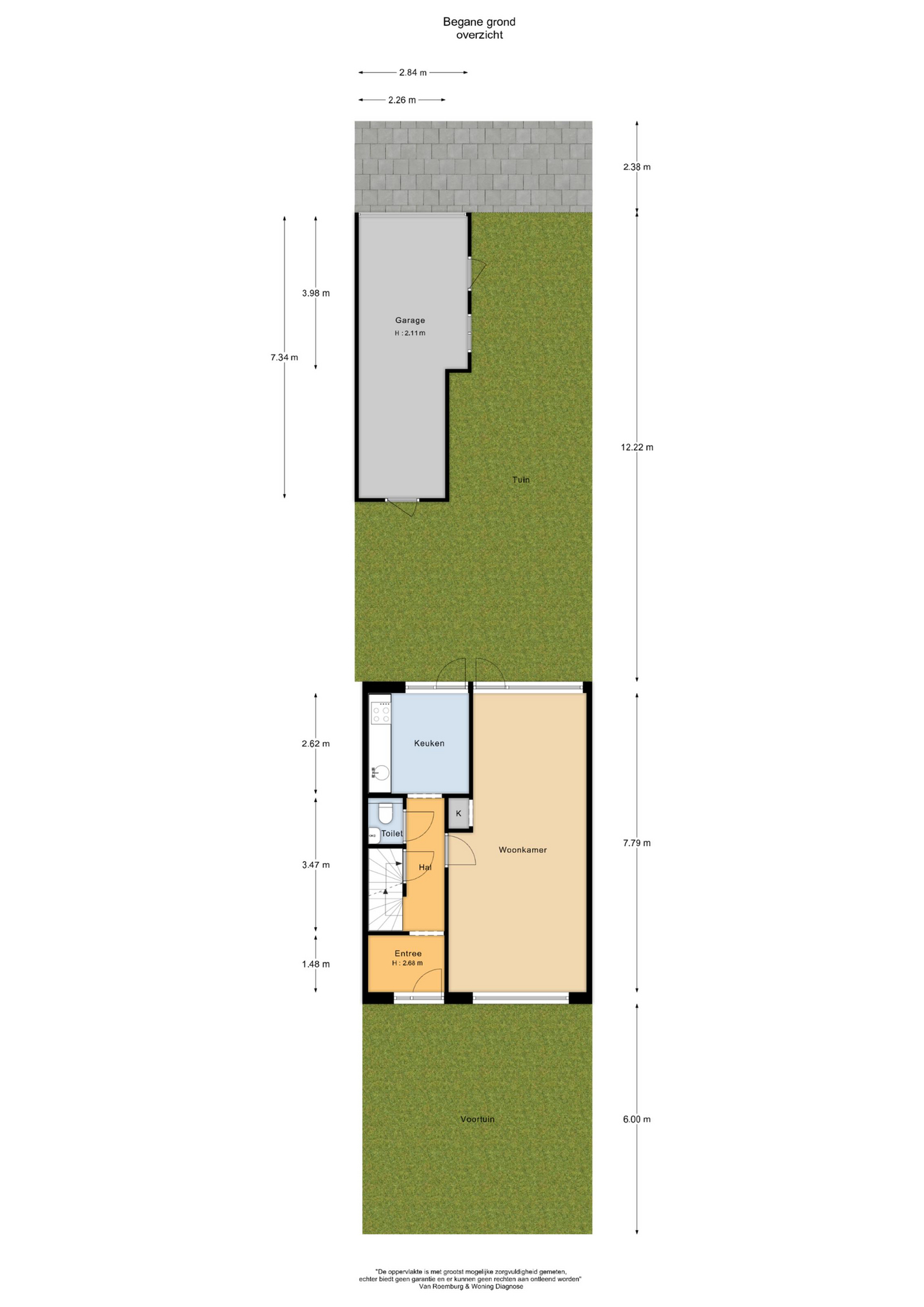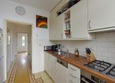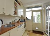 Begane grond: ruime hal, toilet, praktische provisiekelder met aansluitingen voor wasmachine/droger, lichte woonkamer met openslaande deur naar de tuin en een dichte keuken met diverse inbouwapparatuur.