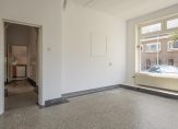 Via de originele entree kom je direct in de voormalige winkelruimte, nu een royale woonkamer met veel licht en zicht op de straat. Hier ligt nog de klassieke terrazzo vloer. Aan de voorzijde vind je een open keuken en een aangrenzende badkamer met douche, wastafel en toilet.