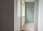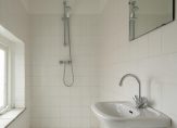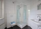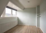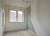 De overloop met houten vloer leidt naar 2 fijne slaapkamers en een tweede badkamer voorzien van douche en wastafel. Ook hier zorgen de grote ramen voor een prettige lichtinval.