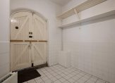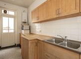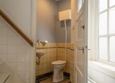 Via de zij-ingang bereik je de berging, gang/hal met toegang tot de dubbele kelderruimte (met cv-opstelling), een separaat toilet, een tweede keuken met originele tegelvloer, een slaap-/werkkamer én een kleine beschutte patio.