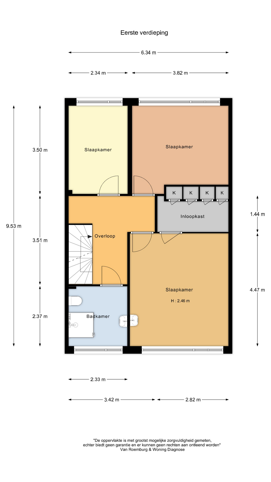 Op de eerste verdieping vind je een ruime overloop met grote inloopkast en toegang tot de drie slaapkamers.