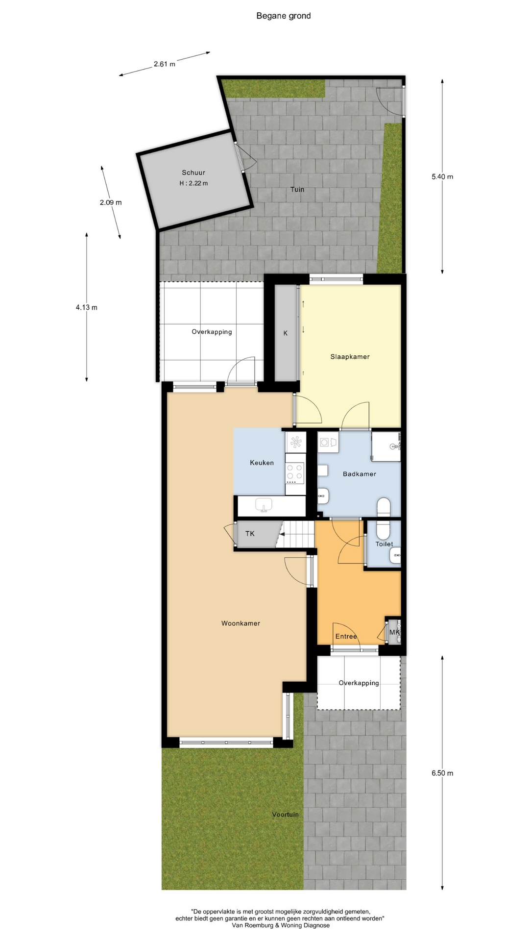 De woning heeft een voortuin met een oprit, geschikt voor het parkeren van een auto. De achtertuin is voorzien van een stenen schuur en een houten tuinhuisje, ideaal voor opslag van o.a. fietsen of tuingereedschap. Verder beschikt de tuin over een terras en een achterom, waardoor de tuin gemakkelijk bereikbaar is.