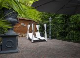 De omsloten achtertuin beschikt over een ruim zwembad met jetstream die zeer nuttig is voor fitness-doelen en een overkapping, buitendouche, buiten toilet, diverse terrassen en een houten berging.